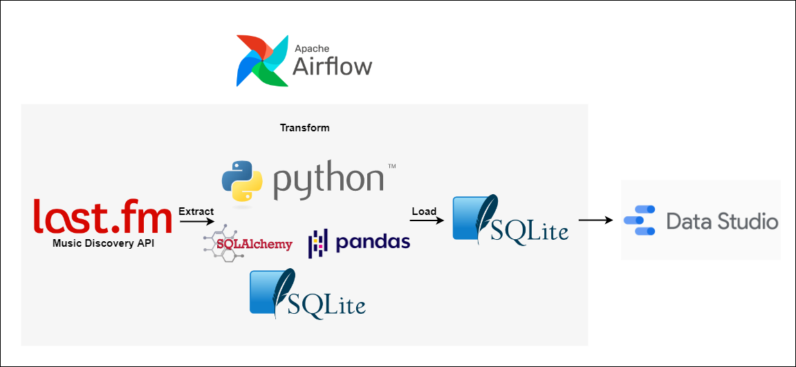 The project is an ETL pipeline which processes music listening data from Last.fm API to provide insight on listening activity. The data is transformed and orchestrated into Kimball's star schema model using Python, SQL, and Airflow. The data is then loaded into Google Data Studio for visualization.